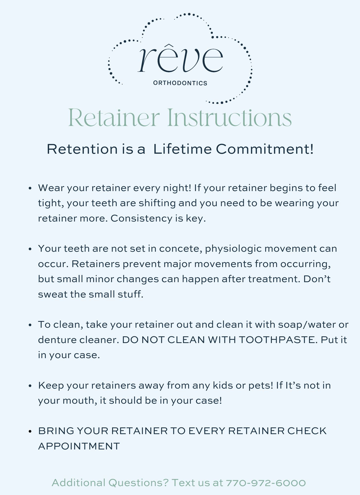 Retainers keep your teeth aligned at the completion of treatment. As the teeth move during orthodontic treatment, the bone around each tooth temporarily softens. A retainer holds your teeth in their new position so that the bone can re-harden around each tooth. Wearing retainers after treatment is critical to keep your teeth in the position achieved. If retainers are not worn as instructed, your teeth can return to the position they were in prior to treatment.